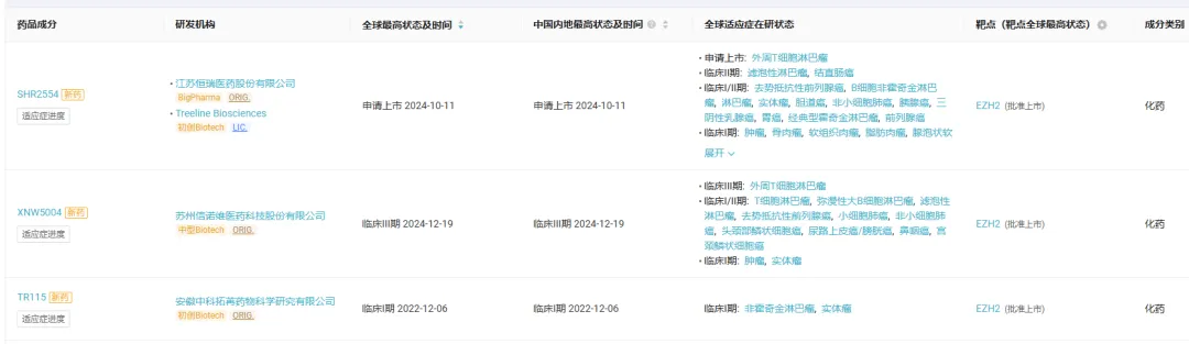 数据库显示,在国产 EZH2 靶向药物赛道上,共有 3 条管线进入临床阶段,恒瑞 SHR2554 进展最快,已处于上市申请阶段,首发适应症为外周 T