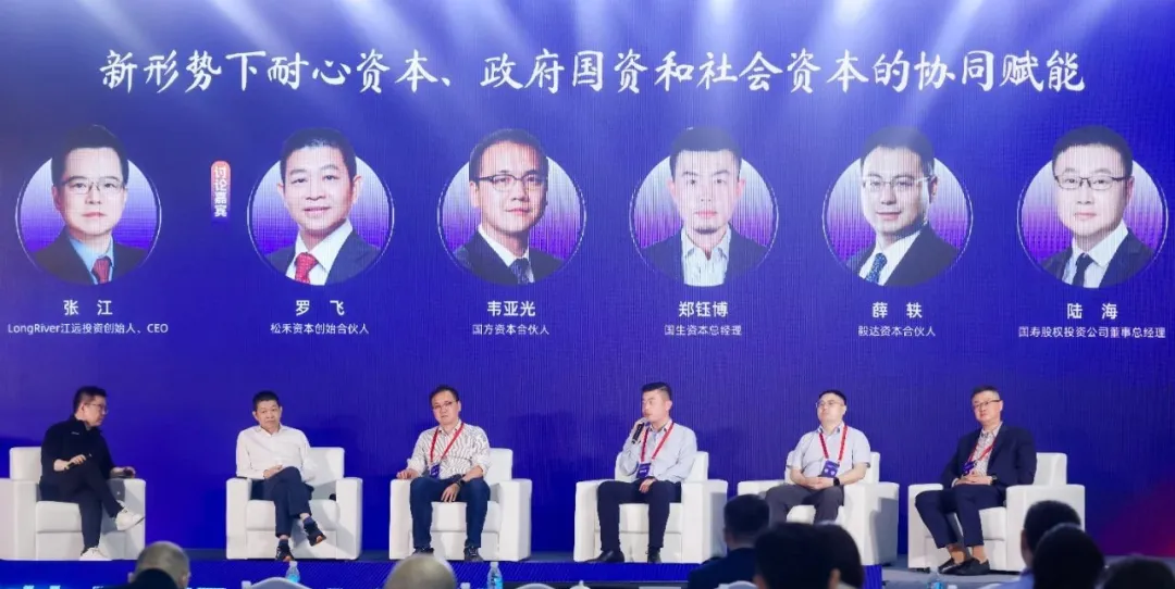 第一阶段讨论由LongRiver江远投资创始人、CEO张江主持,松禾资本创始合伙人罗飞、国方资本合伙人韦亚光、国生资本总经理郑钰博、毅达资本合伙人薛轶、国寿股权投资公司董事总经理陆海围绕“新形势下耐心资本、政府国资和社会资本的协同赋能”进行讨论分享,从险资、国资等角度结合实际案例分享真知灼见。