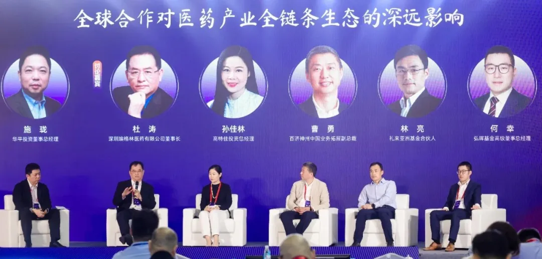 第二阶段主题讨论围绕“全球合作对医药产业全链条生态的深远影响”展开。华平投资董事总经理施珑主持,深圳埃格林医药有限公司董事长杜涛、高特佳投资总经理孙佳林、百济神州中国业务拓展副总裁曹勇、礼来亚洲基金合伙人林亮及弘晖基金高级董事总经理何幸参与讨论。