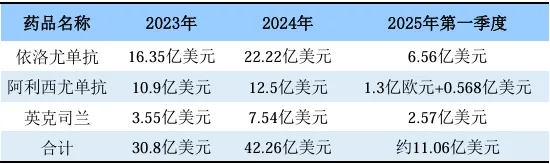 随着获批数量的增加,PCSK9抑制剂的市场规模不断扩张。据公开资料,2024年依洛尤单抗、阿利西尤单抗和英克司兰的销售额总和达422.26亿美元,其中依洛尤单抗销售额进入20亿美元行列。诺华的英克司兰凭借“一针管半年”的长效机制2024年销售额同比增长114%,达7.54亿美元。2025年第一季度英克司兰销售额达2.57亿美元,同比增长+72%,预计2025年全年其销售额有望突破10亿美元。