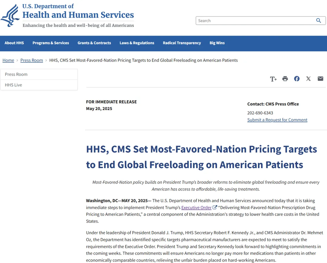 2025年5月20日,美国卫生与公众服务部(U.S. Department of Health and Human Services,HHS)宣布,将立即采取措施实施特朗普总统的行政命令“向美国患者提供最惠国处方药定价”,这是政府降低美国医疗保健成本战略的核心组成部分。