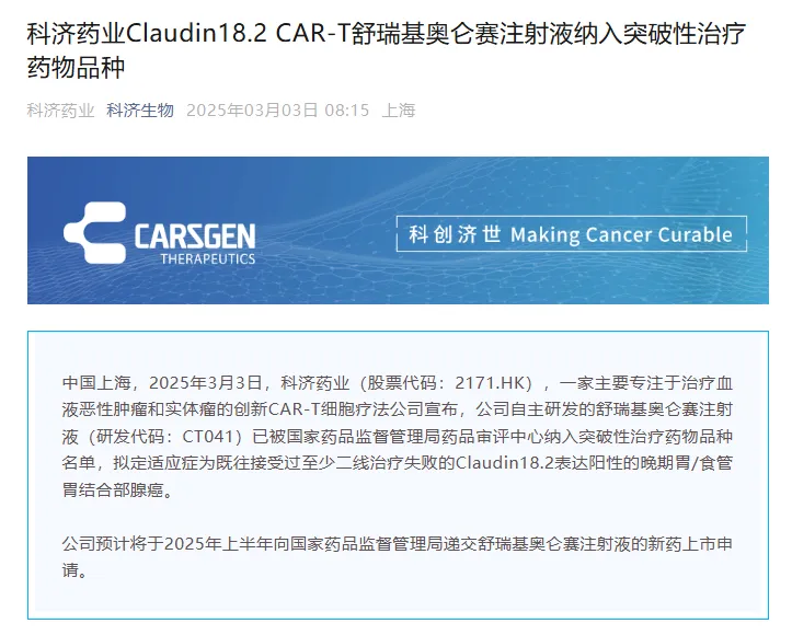舒瑞基奥仑赛注射液(CT041)是由科济药业自主研发的全球首个靶向CLDN18.2的人源化自体CAR-T细胞,本产品自首次人体临床试验至今已历经近8年的研发与验证,前期的研究者发起的试验(IIT)CT041-CG4006(NCT03874897)结果首次重磅公布时,以其远超现有治疗效果的疗效和良好的安全性引起了国内外专家学者、甚至是广大胃癌患者的广泛关注;作为实体瘤CAR-T领域的领军企业之一,科济始终不忘初心,数年踔厉奋发,而今CT041确证性II期试验——全球首个实体瘤CAR-T疗法的随机对照试验——已完成并取得了阳性结果,舒瑞基奥仑赛已被纳入突破性治疗药物品种。科济也将在近期递交新药上市申请,以期可以尽早让更多的晚期胃癌患者得以救治。