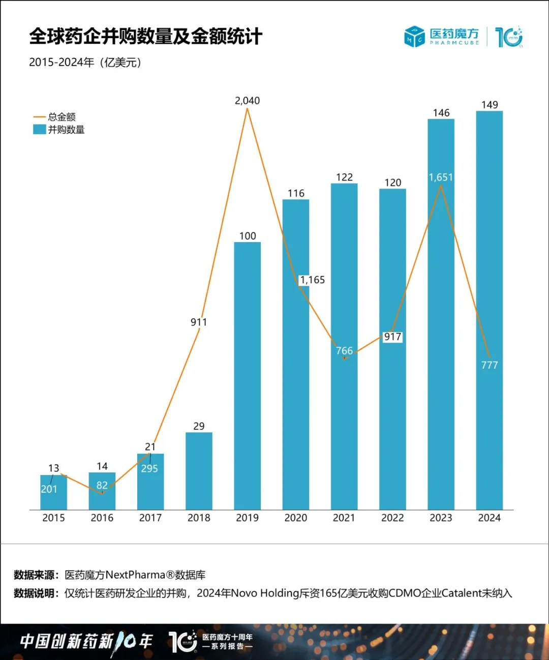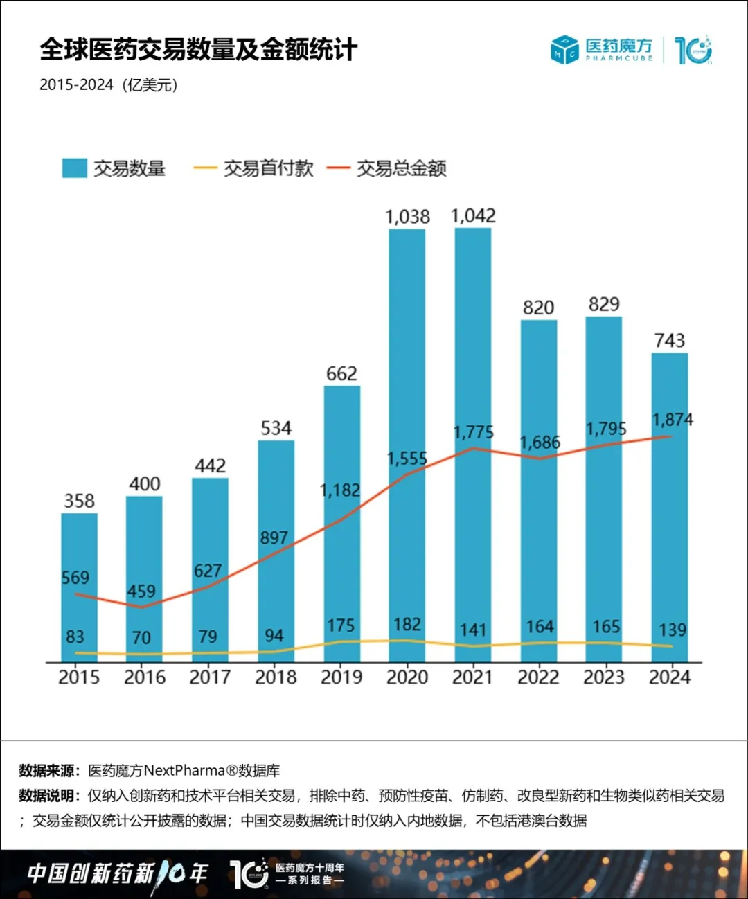 过去十年,全球医药交易数量从2015年的358笔增至2024年的743笔,年复合增长率8%,总交易金额从569亿美元跃升至1874亿美元。中国医药交易增速远超全球,交易数量从55笔增至213笔,总金额从31亿美元飙升至571亿美元。