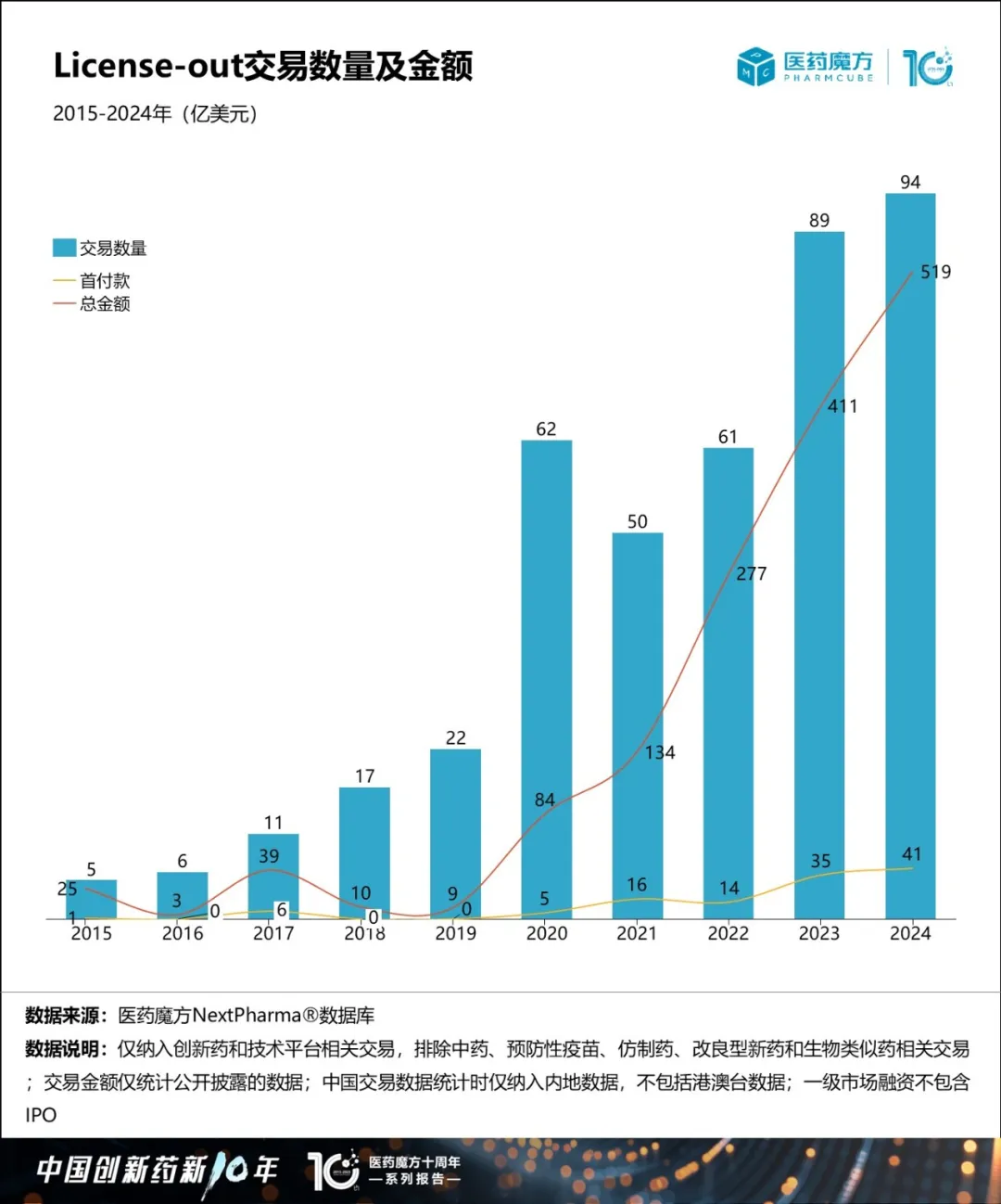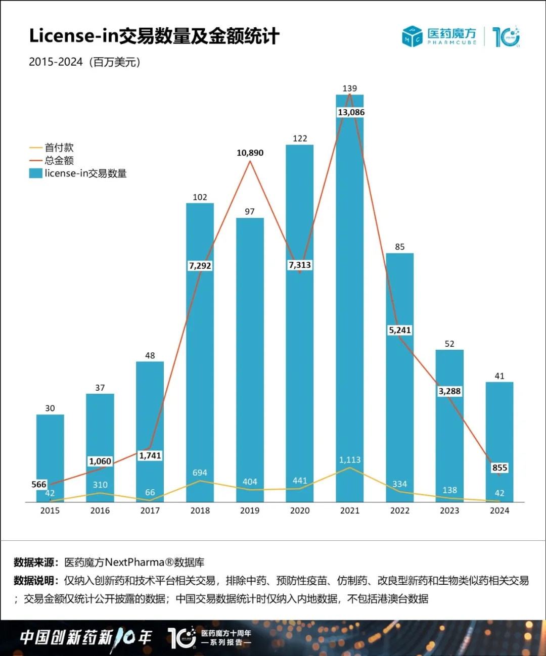 2018-2021年是中国License-in交易高峰期,2021年交易金额达130.86亿美元,随后因资本退潮及国内创新能力提升而快速回落,2024年仅41笔。