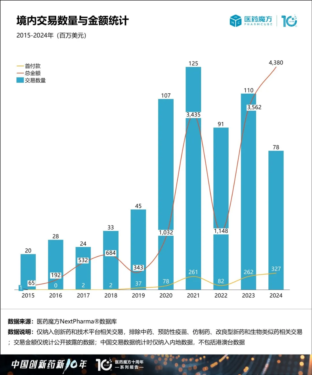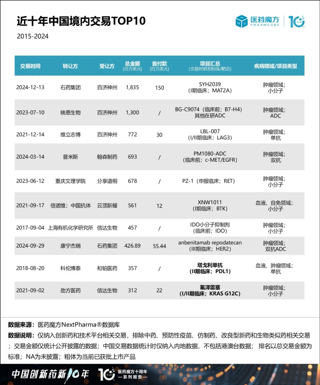 过去十年境内Top10交易集中于2021年后,由国内头部企业驱动,尤其是百济神州,其与石药集团、映恩生物、维立志博的交易也是中国最大的3笔境内交易。