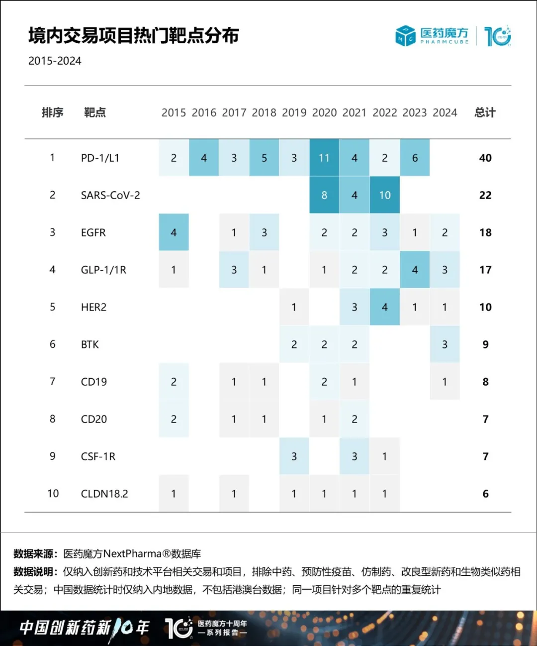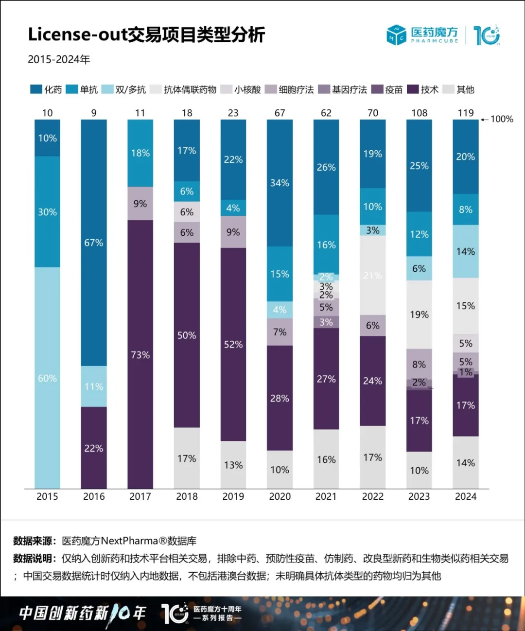 境内交易(本土企业间合作)自2020年起活跃度激增,交易数量与金额与过去五年相比大幅攀升,2024年交易金额创十年新高,成为国内企业引进项目的重要来源。交易项目类型也逐渐多元化,从化药(42%)、抗体(23%)扩展至细胞疗法和小核酸药物。