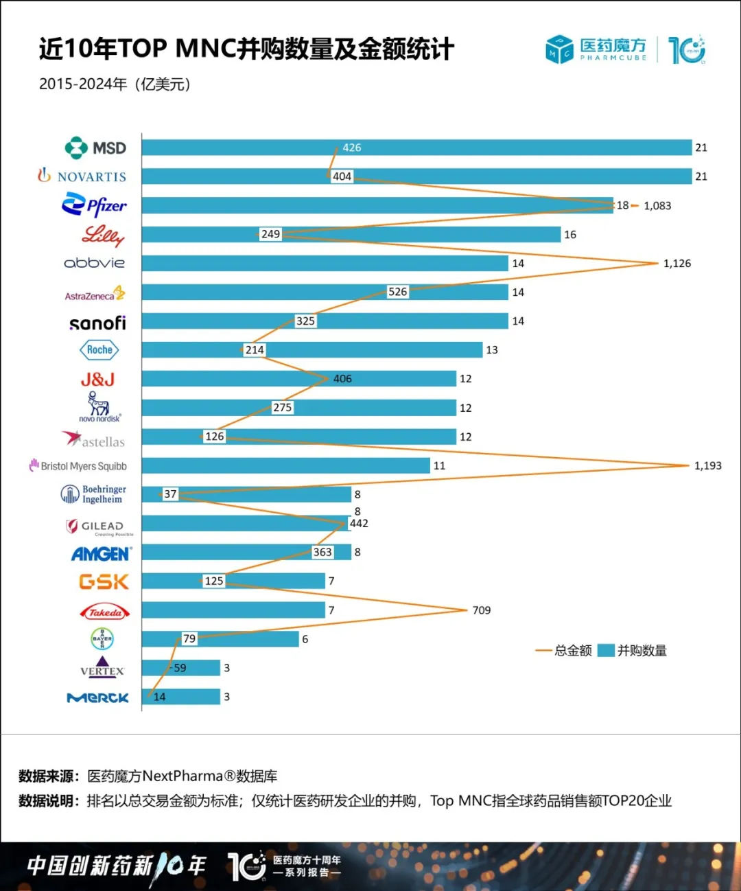 Therapeutics,从而获得了治疗精神分裂症的药物KarXT。总并购金额排名第二的是AbbVie,专注于并购ADC或抗体技术平台企业以及CNS领域开发为特色的企业。并购动作最频繁的两家MNC为Merck