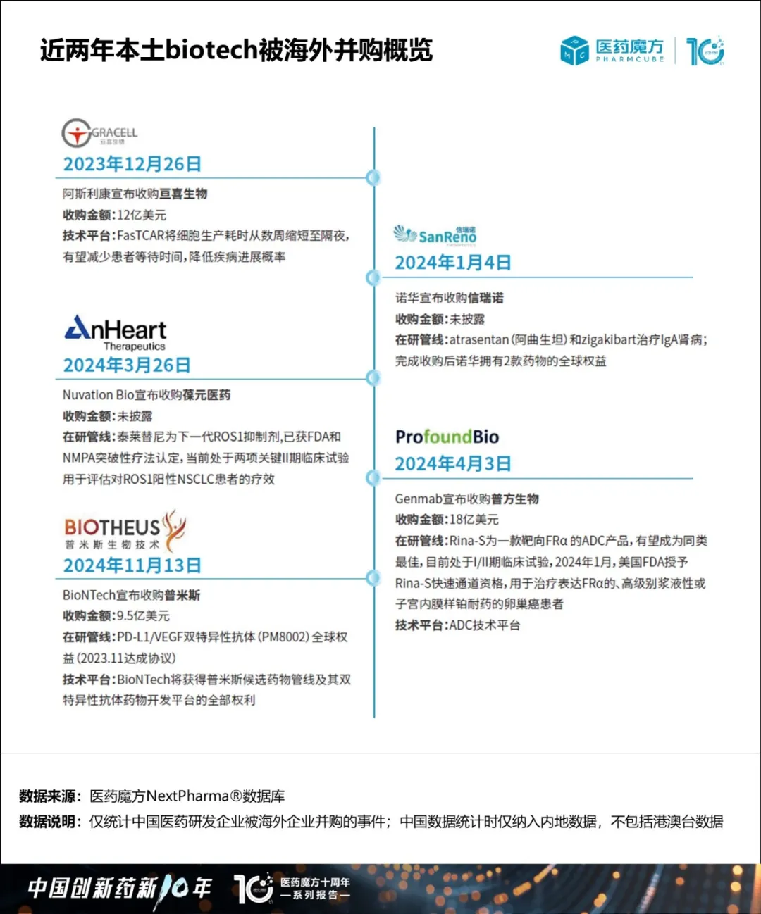 整体投融资环境遇冷的背景下,公司被并购成为中国biotech实现退出的一条路径。2023年年底开始,本土biotech被海外企业并购事件频发,两年间达成5笔并购,进一步说明了我国biotech创新能力获MNC认可。Genmab以18亿美元收购普方生物位居并购金额榜首。值得关注的,在5起并购中3起均有自己的核心技术平台,无论是亘喜生物的fastCAR技术、普方生物的ADC技术平台还是普米斯的双特异性抗体技术平台,都体现出平台型企业的价值。