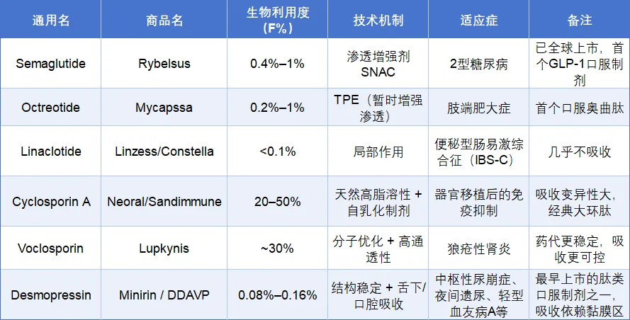 表1. 部分上市口服多肽