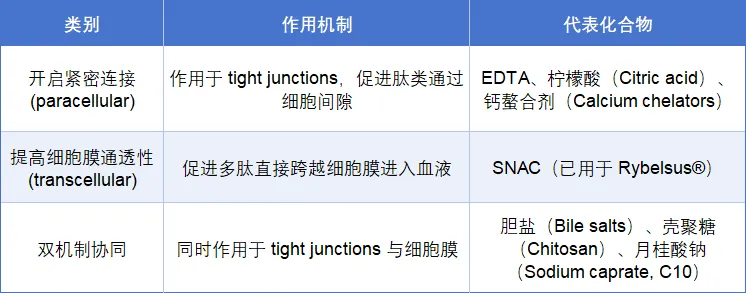 渗透增强剂(Permeation Enhancers,PEs)通过短暂性调控上皮屏障结构或细胞膜通透性,实现增强多肽肠道吸收的目的(表2)。