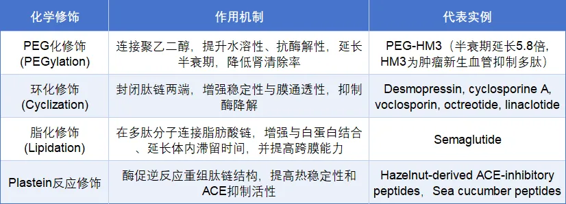 通过对多肽主链或侧链结构的化学修饰,可有效提升其酶稳定性、水溶性和体内半衰期(表3)。