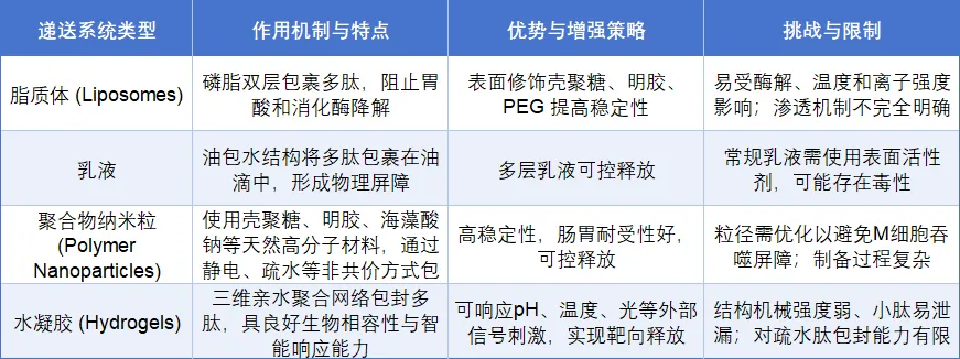将多肽包封于微纳米结构中可提供胃肠道保护、缓释释放与靶向吸收能力,是目前应用最广泛的递送平台之一(表4)。