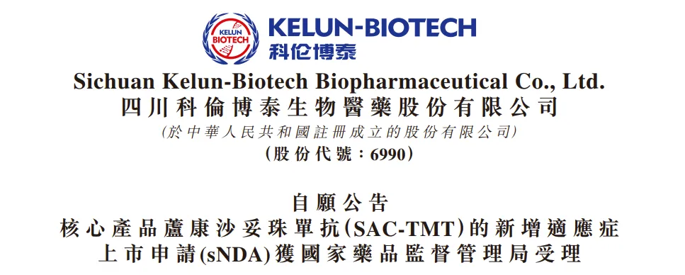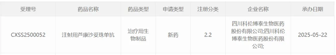 2025年5月22日,科伦博泰Trop2 ADC新药芦康沙妥珠单抗的新适应症上市申请获得受理,这也是其申报的第4个适应症。