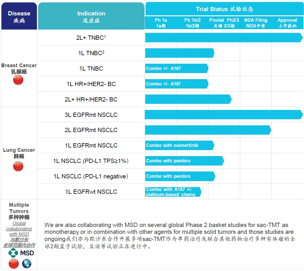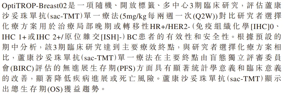 此次上市申请是基于OptiTROP-Breast02三期临床数据,根据预设的中期分析,该三期临床达到PFS主要终点,同时显示出OS获益趋势。