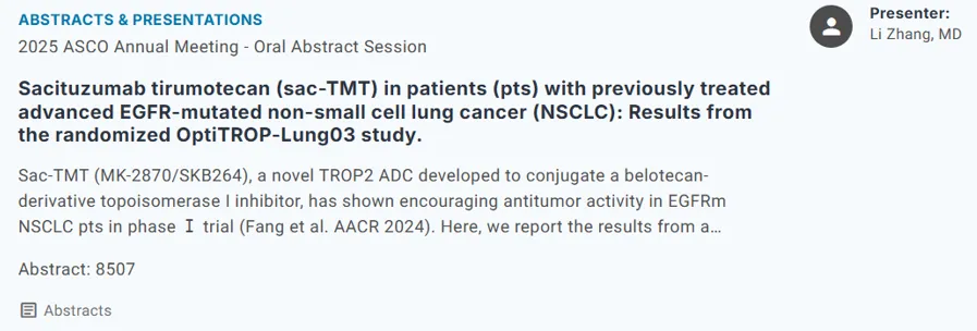 OptiTROP-Lung03是一项随机、对照、多中心关键注册性研究,旨在评估sac-TMT对比多西他赛用于既往接受过EGFR-TKI和含铂化疗治疗(序贯或联合)的局部晚期或转移性EGFR突变NSCLC患者的疗效和安全性,该项研究数据将于近日以口头汇报的形式在ASCO年会上发布。
