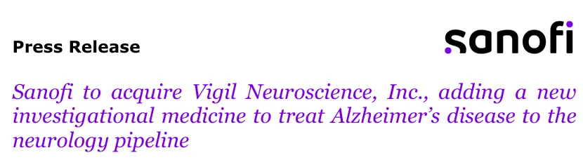 2024年6月,赛诺菲对Vigil进行了4000万美元的战略投资,其中包括VG-3927研究、开发、制造和商业化独家许可、授予或转让的独家优先谈判权。此次收购证明了赛诺菲在股权投资方面的积极态度,以确保在应对关键的医疗挑战方面有更大的选择权。通过对Vigil等有前景的企业进行战略投资,赛诺菲展示了其前瞻性战略如何转化为神经学管道的切实进步,并加强了对创新的承诺。