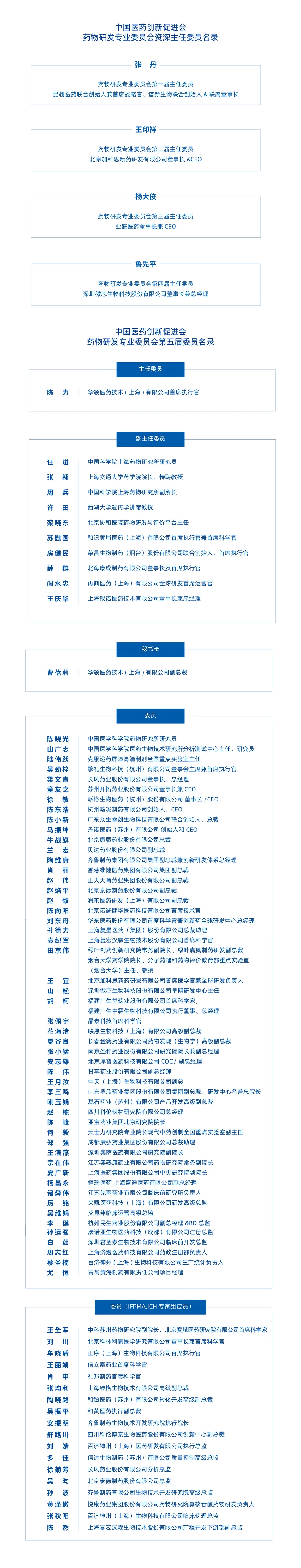华领医药首席执行官陈力博士当选第五届主任委员,上海药物所研究员任进教授、上海交通大学药学院院长张翱教授、上海药物所周兵副所长、西湖大学遗传学讲席教授许田教授、北京协和医院药物研发与评价平台栾晓东主任、和记黄埔医药首席执行官苏慰国博士、荣昌生物联合创始人及首席执行官房健民博士、北海康成董事长及首席执行官薛群博士、再鼎医药全球研发首席运营官阎水忠博士、银诺医药董事长及总经理王庆华博士当选第五届副主任委员,华领医药副总裁曹蓓莉女士当选第五届秘书长。
