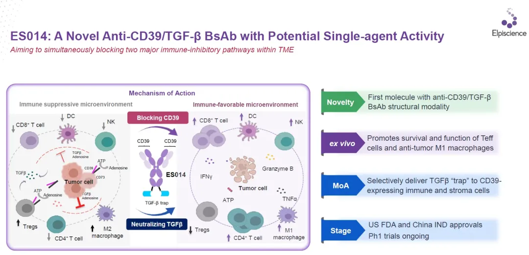 ES014:一款全球首创的CD39xTGF-β双特异性抗体。目前,其正在中国开展I期临床研究,初步结果显示出良好的耐受性和积极的疗效。2025年3月,ES014联合PD-1抗体的II/III期临床试验已获得国家药监局IND批准。