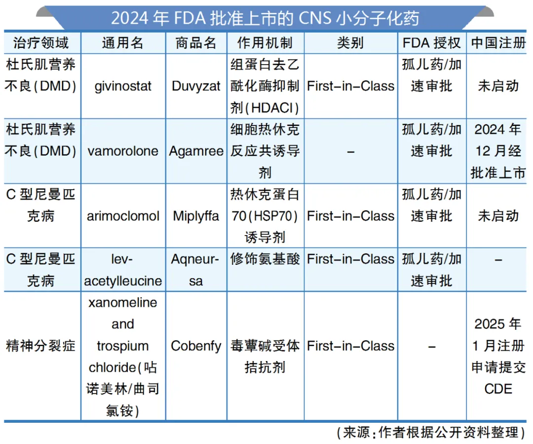 在这一波研发浪潮中,小分子药物表现出独特的活性调控能力、靶点穿透优势和适应症广泛性,成为多个机制性创新的代表。笔者聚焦三款2024年问世的CNS小分子化药,涉及罕见神经肌肉病、神经罕见病及精神疾病,分析此类药物在不同维度上的研发突破。