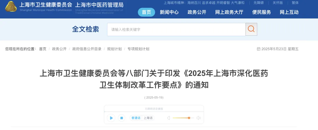 5月19日,上海市卫健委官网公布由该委、市发改委、市人社局、市医保局、市药监局、市编制办等8部门制定的《2025年上海市深化医药卫生体制改革工作要点》(以下简称《要点》),其中,药品耗材集采、紧密型医联体,以及指导中山、瑞金两家医院深化薪酬分配制度改革值得关注。