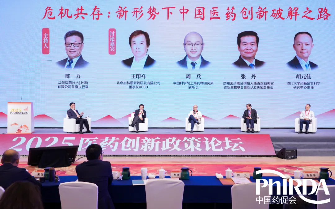 随后,论坛进入主题讨论环节。主题讨论第一阶段由陈力博士主持,围绕“危机共存:新形势下中国医药创新破解之路”主题展开。讨论嘉宾王印祥博士表示,当前创新药如何获得研发回报仍是关键问题,面向欧美国家的“出海”是创新药的必经之路。他期待未来能够突破我国与周边国家的药品监管机制壁垒,利用“一带一路”等政策推动国产创新药更好出海。周兵副所长从源头创新的角度进行剖析。他提到尽管我国每年发表的论文不少,但真正的原创靶点尚未出现,基础研究和临床需求未能有机结合。未来上海药物研究所将继续与更多医院开展合作,并在新发突发传染病方面开展创新研究。张丹博士提到美国推出的各项医药政策或将成为中国医药产业“弯道超车”的契机。他表示,今年我国二级市场的生物医药板块呈现积极态势,License-out交易再创新高,此时我国医药产业更应凭借人才优势和临床优势再攀高峰。胡元佳主任介绍了当前澳门大学的科研情况,并表示自2015年之后,中国医药产业发生了巨大的改变,澳门大学也在靶点筛选、优化分子形式和出海交易设计方面与企业展开合作。他相信随着中国创新成果获得国际认可,医药产业必将取得更多成就。