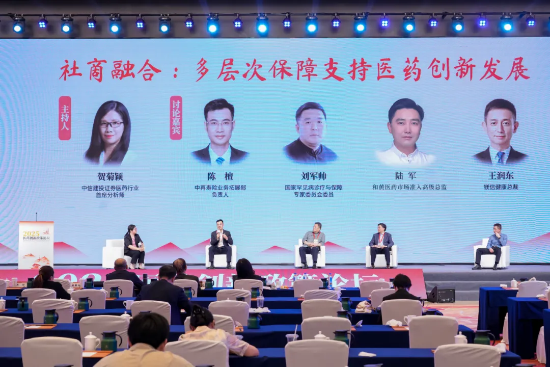 第二阶段讨论,围绕“社商融合:多层次保障支持医药创新发展”主题展开。中信建投证券医药行业首席分析师贺菊颖主持,中再寿险业务拓展部负责人陈檀,政策专委会副主委刘军帅,镁信健康总裁王润东以及和黄医药市场准入高级总监陆军展开讨论。嘉宾一致认为,如何通过顶层制度的设计,使各方在协调共融中发展,是基本医保与商保在结合过程中需重点讨论的议题。嘉宾们呼吁产业端与保司,在患者管理以及数据和信息共享上进行更深度的合作探索,从而优化保险产品设计、加强投保人管理工作,提升商保的发展韧性,厚积薄发。