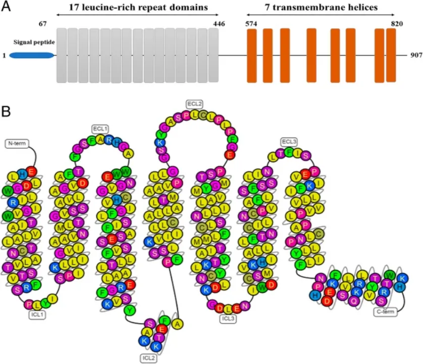 LGR5这个靶点全称为富含亮氨酸重复序列的G蛋白受体5,由LGR5基因翻译,其具体蛋白质结构如图所示。LGR5 在多种组织中表达,例如肌肉、胎盘、脊髓和脑,特别是作为某些组织中成体干细胞的生物标志物。
