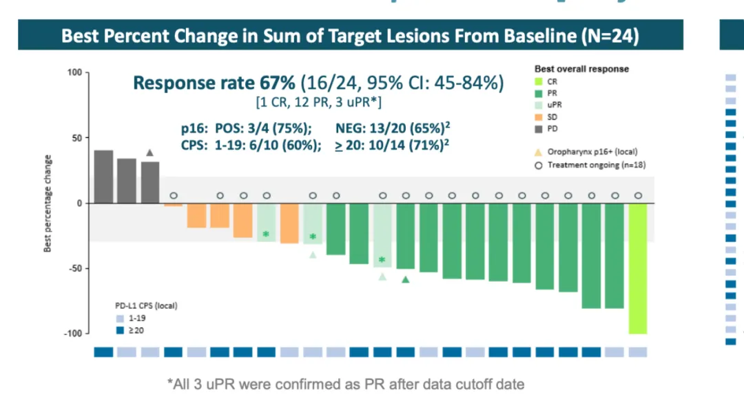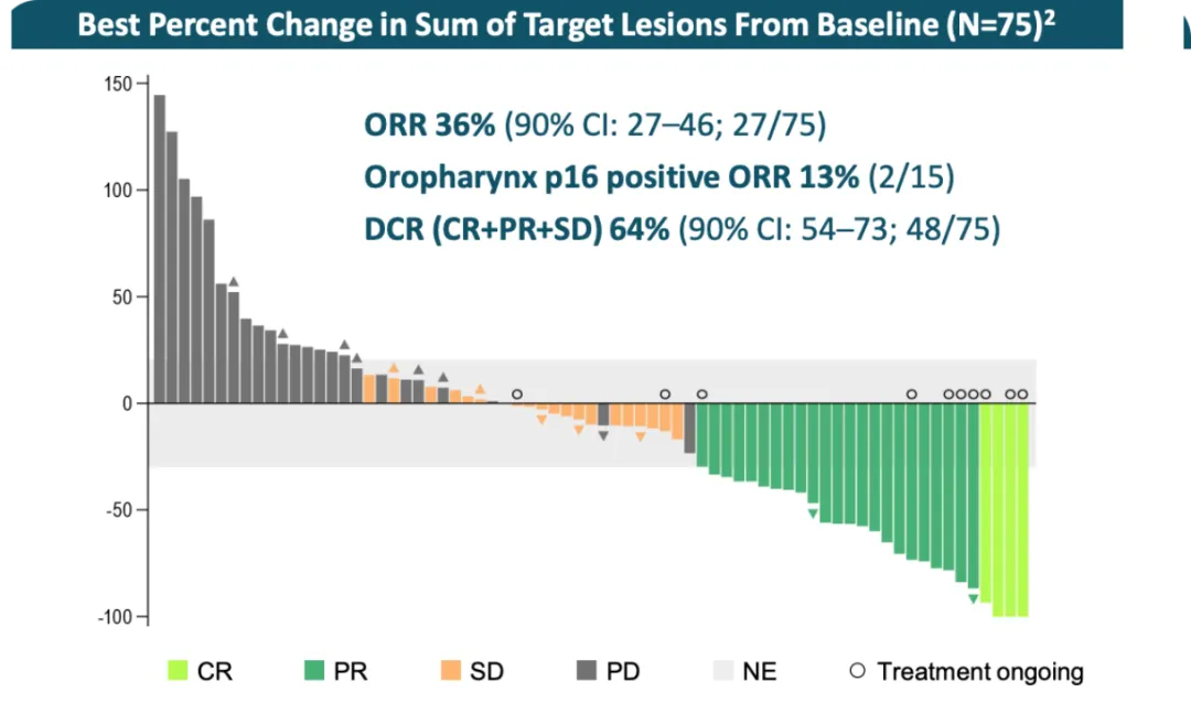 而在单药后线治疗头颈鳞癌的数据来看,也很不错。在受试者达到75的中型样本量的情况下,ORR达到了36%。