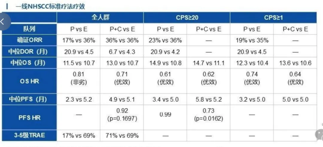 头颈鳞癌目前情况如何?根据2024CSCO头颈癌指南,一线RIR头颈癌(远处转移)治疗的1级推荐方案为帕博利珠单抗+卡铂/顺铂+5-FU,基于3期临床KEYNOTE-048试验结果。KEYNOTE-048纳入882名无法通过局部治疗治愈且未经过系统治疗的复发/转移性(R/M)HNSCC患者,患者将随机分配接受帕博利珠单抗(P,n=301)、帕博利珠单抗+化疗(P+C,n=281)或西妥昔单抗(EGFR单抗,以下简称E,n=300)治疗。