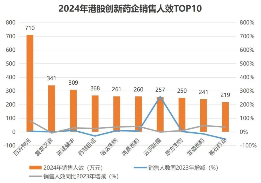 明星企业的光环闪耀之下,是港股创新药企集体升级:2024年销售人效TOP10均超过200万,而2023年只有5家,整体上了一个台阶。