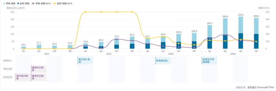 在销售人数微增12%至342人的情况下,宜诺凯®销售额同比增长49%,可见医保放量作用显著。医药魔方BI IPM数据库显示,正是从2024年新版医保目录执行、医保支付范围调整开始,宜诺凯®从第二季度迈上2亿元销售额的台阶,随后维持在这一水平。