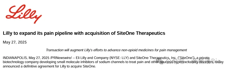 5月27日,礼来宣布以10亿美元收购SiteOne Therapeutics,一家开发钠通道小分子抑制剂以治疗疼痛和其他神经元过度兴奋障碍的私人生物技术公司。