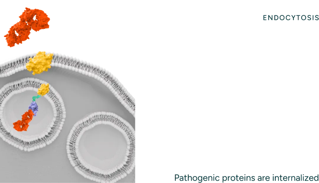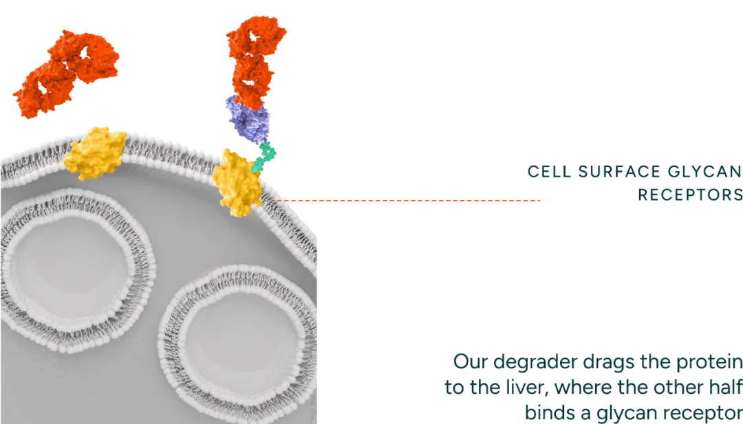 致力于开发best-in-class细胞外蛋白降解剂,用于治疗自身免疫性疾病。其开发的降解剂是一种双特异性分子,分子的一部分结合靶蛋白,另一部分结合内吞受体,内吞受体可将靶蛋白转运到溶酶体进行降解。