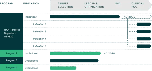 公司主导项目GE8820专注于降解致病性IgG4自身抗体。该靶点在寻常型天疱疮、抗肌特异性激酶(MuSK)重症肌无力、原发性膜性肾病和自身免疫性脑炎等多种自身免疫性疾病中起关键作用。临床前数据显示,GE8820能在多种模型中实现IgG4的深度持续清除,展现出广阔的疾病治疗潜力。