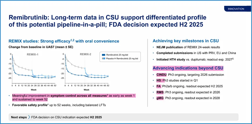 Remibrutinib是诺华在免疫学领域布局的一款重磅产品,有望在多种自身免疫疾病中发挥治疗作用,包括慢性自发性荨麻疹(CSU)、慢性诱导性荨麻疹、化脓性汗腺炎、食物过敏、多发性硬化症、全身型重症肌无力、干燥综合征。此前,Remibrutinib用于治疗CSU的两项III期研究REMIX-1和REMIX-2均达到了主要终点,即第12周时每周荨麻疹活动评分(UAS7)较基线的绝对变化,研究表明Remibrutinib起效迅速,疾病活动得到了具有临床意义和统计学意义的改善,并持续至第52周。图4.Remibrutinib临床进展