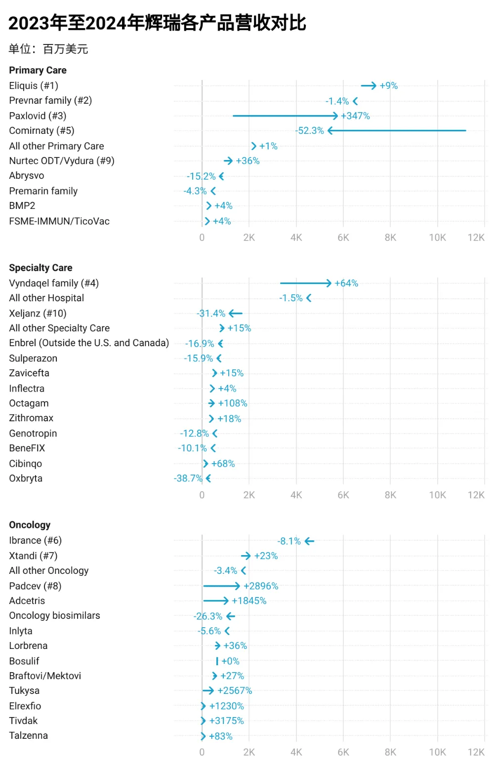 从具体销售额来看,基础护理业务中,心血管药物、COVID-19相关产品、偏头痛类药物占据主导。其中,心血管药物Eliquis以73亿美元的销售额位居榜首,紧随其后的是Prevnar疫苗系列、新冠药物Paxlovid和Comirnaty,分别实现销售额64亿、57亿和53亿美元。在专科护理业务中,罕见病药物Vyndaqel系列表现抢眼,销售额达54亿美元;自免老将Xeljanz贡献11亿美元。肿瘤业务方面,乳腺癌药物Ibrance以43亿美元的销售额位居第一,前列腺癌药物Xtandi销售额为20亿美元。