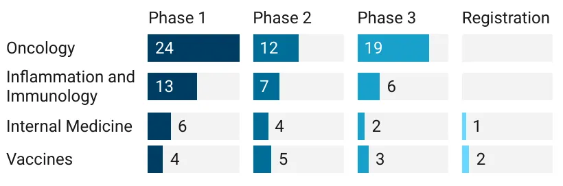 辉瑞的研发投入主要集中在自免、内科、肿瘤和疫苗四大领域,其中肿瘤是核心中的核心,研发投入占比高达50.9%。