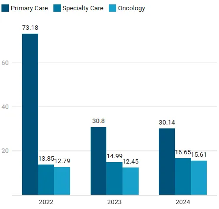 2024年,辉瑞总营收达到636亿美元。其业务结构主要分为三大块:基础护理(Primary Care)、专科护理(Specialty Care)和肿瘤(Oncology)。基础护理部分占比47%,但近三年来,这一板块营收占比逐年下滑,与去年相比,同比下降2%。与此同时,专科护理和肿瘤业务却呈现出快速增长的态势,尤其是肿瘤业务,同比增长率高达25%,成为增长的强劲引擎。