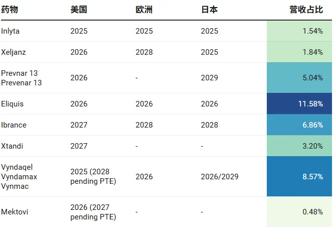 辉瑞未来3年将面临8个重磅产品在美国、欧洲、日本的专利集中到期。这些产品的销售额在2024年总营收中占比高达40%,累计达250亿美元。与此同时,所有正增长的产品(排除未来三年面临专利悬崖的产品)在2024年的累计营收占比仅为27%,即173亿美元,这意味着辉瑞将面临近80亿美元的营收缺口,填补这一缺口成为当务之急。