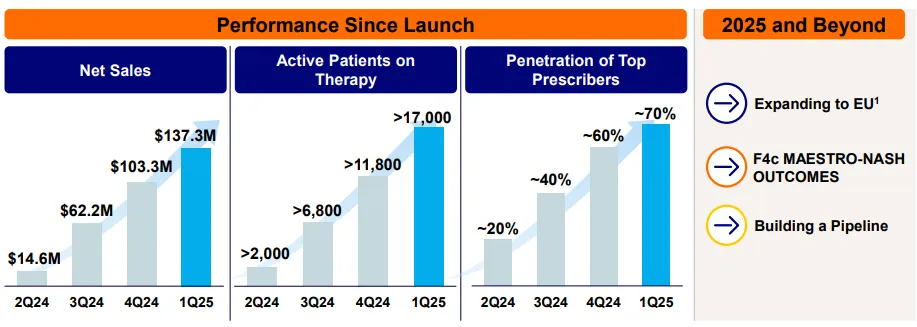 Madrigal Pharmaceuticals:核心资产为Rezdiffra(Resmetirom),一种口服、肝脏靶向的THR-β选择性激动剂。已于2024年初获得FDA批准,用于治疗伴有中度至晚期肝纤维化(F2/F3期)的NASH成人患者,是美国FDA批准的首个专门针对NASH的药物。自2024年Q2上市以来,销售额已迅速达到3亿美元,超过17000名患者正在用药,并已覆盖70%的顶尖处方医生群体,显示出强劲的市场渗透能力。预计峰值销售额可达35亿美元。