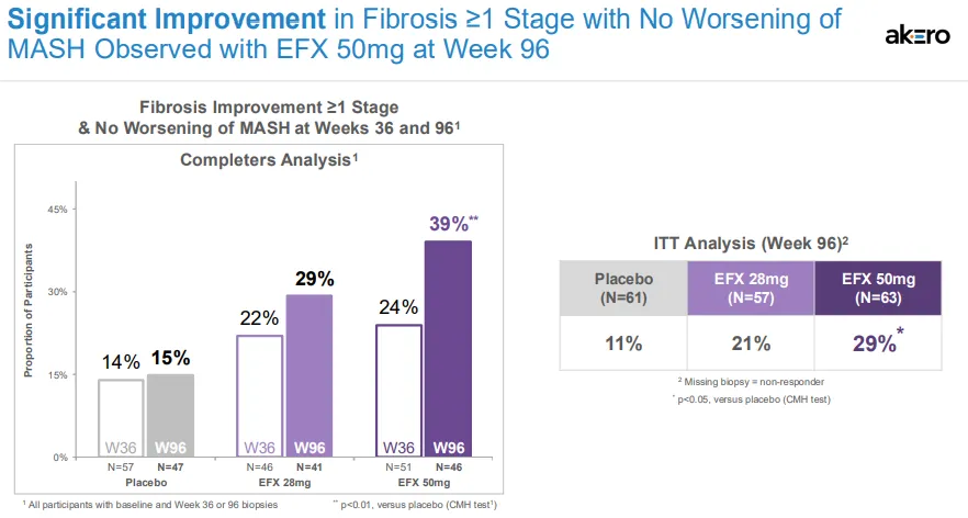 EFX组有39%的患者实现纤维化改善≥1个阶段且MASH没有恶化,显著优于安慰剂组的15%