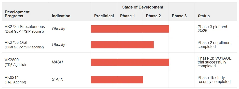Viking Therapeutics:其核心资产为VK2735,一种GLP-1/GIP双重激动剂,同时开发皮下注射和口服两种剂型。