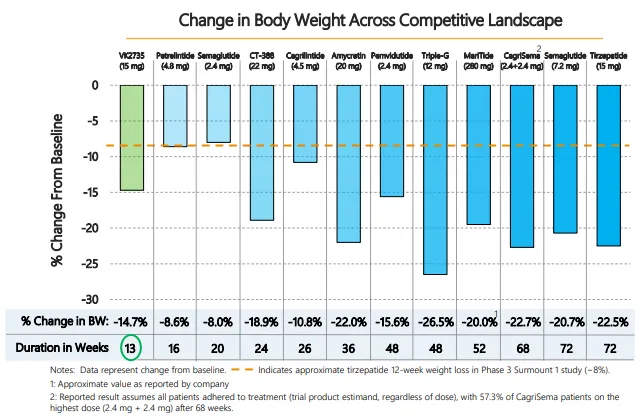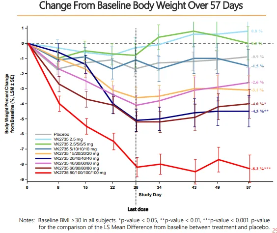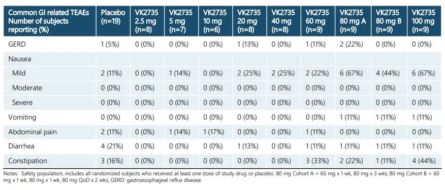 安慰剂),同样在给药后4周内可保持减重效果。口服版VK2735展现出较好的胃肠道耐受性,因副作用导致的停药率较低。