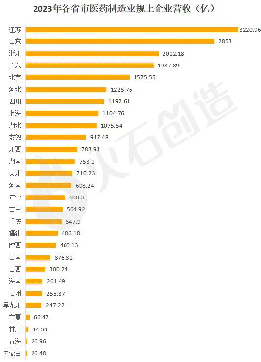 江苏的“断层式领先”并非偶然。作为我国生物医药产业“第一梯队”,江苏拥有7个国家级生物医药产业集群(全国前列),覆盖化学药、生物药、医疗器械等全链条,企业集聚度高。从创新药研发到高端医疗器械制造,江苏已形成“研发-生产-销售”一体化生态,2023年营收比第二名山东高出367.96亿元,领先幅度达12.87%。