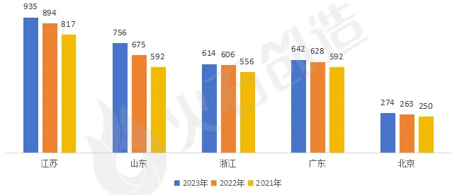 2023年医药制造业规上企业营收前五名依次为:江苏(3220.96亿)、山东(2853亿)、浙江(2012.18亿)、广东(1987.8亿)、北京(1641.3亿)。其中,江苏以超3200亿元的营收稳居榜首,占全国总营收的12.88%,相当于每100元医药产值中,就有近13元来自江苏。
