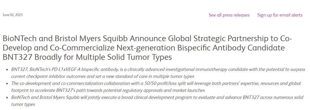 6月2日,BMS和BioNTech宣布双方达成协议,将在全球范围内共同开发和商业化后者的PD-L1/VEGF双抗BNT327。根据协议,BMS将向BioNTech支付15亿美元的首付款,并在2028年前支付总计20亿美元的非或有性周年付款。