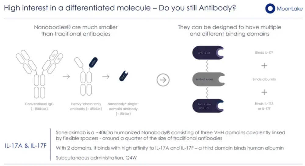 Sonelokimab是一种靶向IL-17A/F的三抗药物,由三个VHH结构域组成,第三个中心结构域与人类白蛋白结合,可促进sonelokimab在炎症水肿部位的进一步富集。