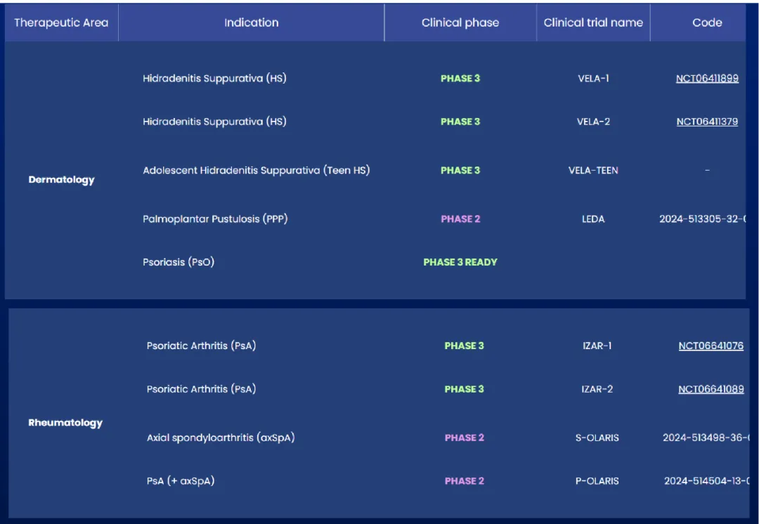 目前Moonlake开发了Sonelokimab针对化脓性汗腺炎(HS)以及银屑病关节炎(PsA)、掌跖脓疱病(PPP)和轴性脊柱炎(axSpA)等适应症。