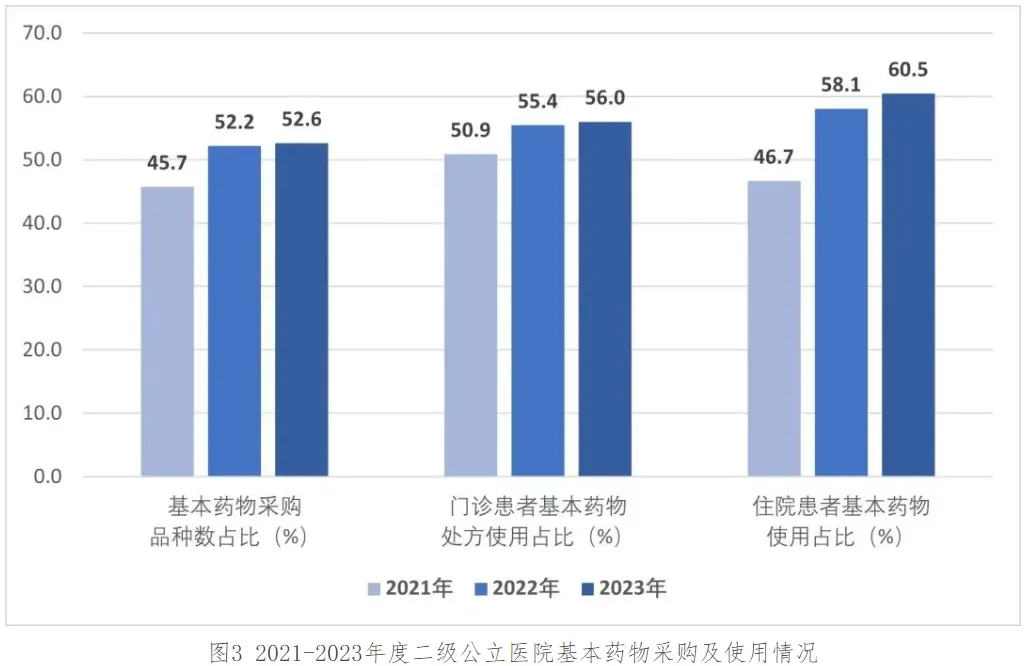 2023年全国二级公立医院基本药物采购品种数占比52.6%,较2022年增长0.4个百分点;门诊患者基本药物处方使用占比(56.0%)和住院患者基本药物使用占比(60.5%),分别较2022年增长0.6、2.4个百分点(见图3)。