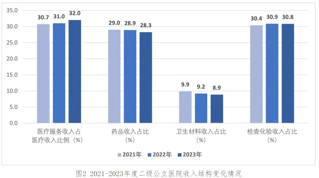 2023年二级公立医院医疗服务收入(不含药品、耗材、检查检验收入)占医疗收入比例32.0%,较2022年增长1.0个百分点,药品、卫生材料、检查化验收入占比均较2022年呈下降趋势(见图2)。重点监控高值医用耗材收入占比23.1%,较2022年下降4.7个百分点。